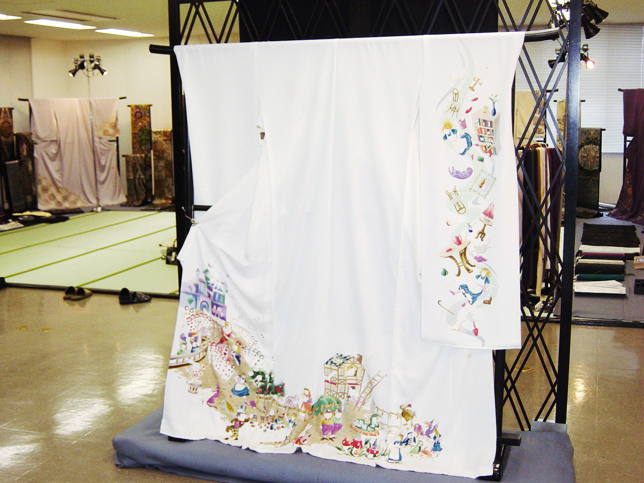 着物や帯の絵柄に佐野正喜の世界を展開する。